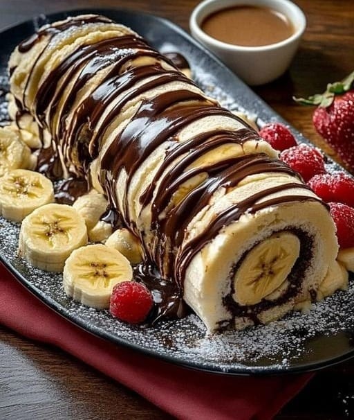 Denne lækre roulade kombinerer delikat chokolade, luftig fløde og friske bananer til en uimodståelig dessert. Perfekt til særlige lejligheder eller blot til at forkæle dig selv! Kombinationen af luftig kagebund, cremet chokoladefyld og frugtige bananer skaber en harmonisk smagsoplevelse. Lad dig inspirere af denne enkle, men imponerende opskrift!