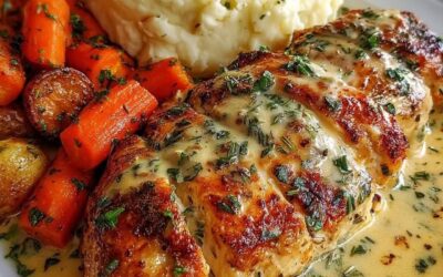 Kylling med gyldent hvidløg og krydderurter, cremet kartoffelmos og honningsmørgulerødder