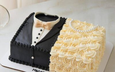 Et kreativt design, hvor kagen er delt i to halvdele. Den ene halvdel ligner en goms smoking med sort fondant,…