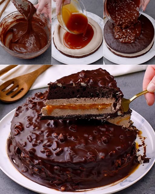 Hæld halvdelen af dejen i formen og fordel karamelfyldet ovenpå. Dæk med den resterende dej.