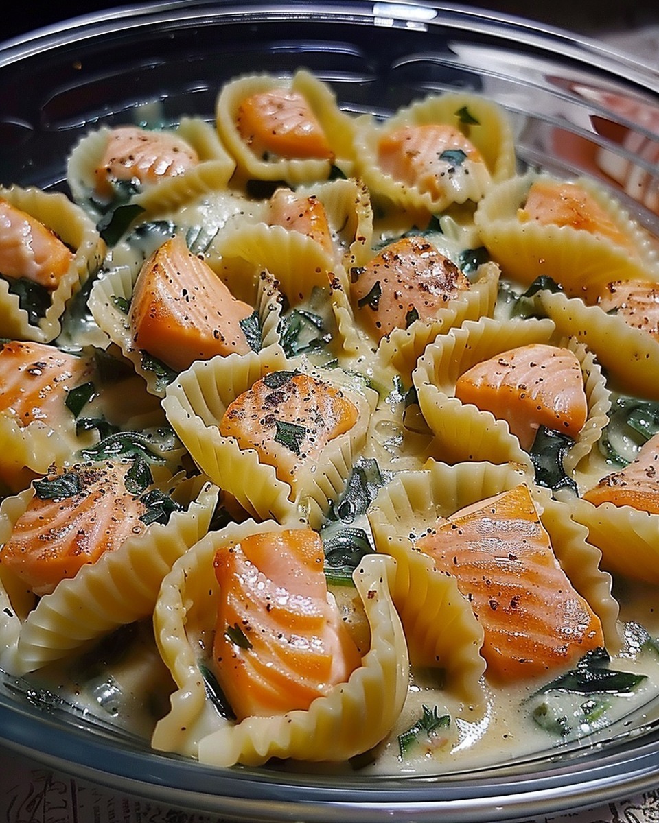 – Conchiglioni – Zucchini – Olivenolie – Hvidløg – Røget laks – Béchamelsauce – Revet parmesanost – Salt – Peber – Hakket persille