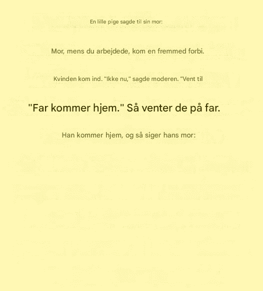 Et par timer senere ankommer far. Han har lige lagt sin mappe, da mor stirrer på ham med armene over kors, som om hun er klar til kamp.