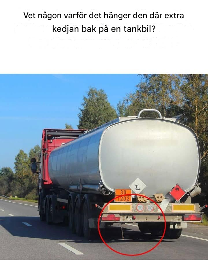 Den ekstra kæde, der er fastgjort bag på en tankbil, fungerer som en jordforbindelse. Dens primære rolle er at aflede statisk elektricitet, der kan opbygges under transport af brandfarlige væsker. Friktion mellem væsken og tanken, samt lastbilens bevægelse, kan generere statisk elektricitet. Hvis den ikke håndteres korrekt, kan denne statiske ladning forårsage gnister, hvilket udgør en betydelig risiko for, at lasten antændes. Ved at gnide mod jorden tillader kæden, at statisk elektricitet afledes sikkert i jorden, hvilket reducerer risikoen for brand eller eksplosion.