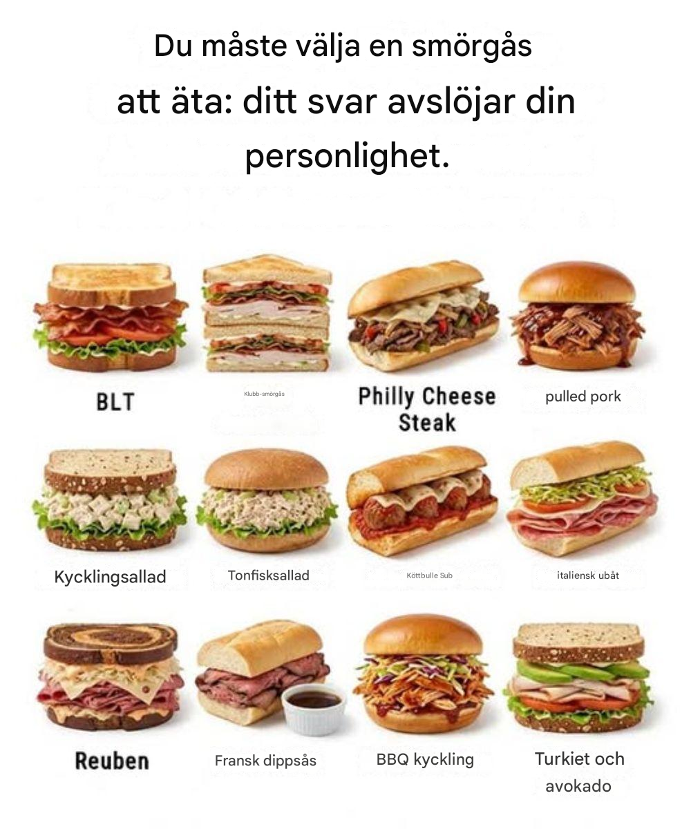 Hvad nu hvis en simpel sandwich, som din, sagde meget om din personlighed? Vores madvalg afspejler ofte meget mere end smag: de afslører vaner, værdier og endda karaktertræk. Se på disse sandwich. Hvilken ville du vælge?
