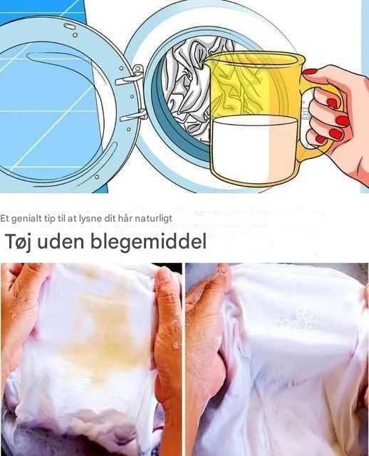 Det er sikkert at bruge på lyst tøj. Tilsæt blot to teskefulde til din skyllemiddeldispenser i slutningen af vaskecyklussen. Du vil blive forbløffet over det endelige resultat!