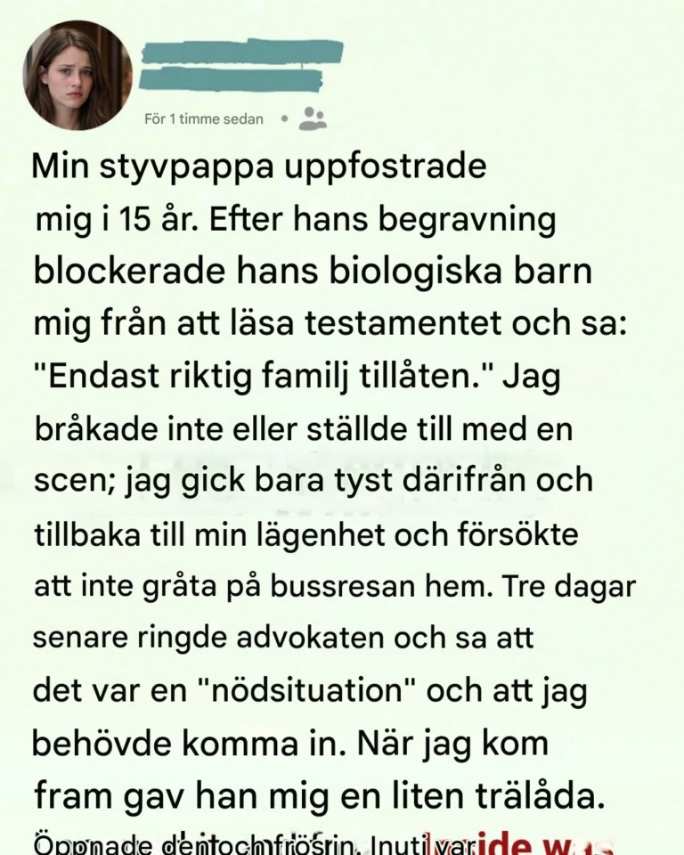 Da jeg nærmede mig advokatens kontor, trådte hans biologiske børn ind foran døråbningen. Vi havde boet under samme tag i årevis, men vi havde aldrig rigtig kendt hinanden. Vi sameksisterede høfligt, intet mere.