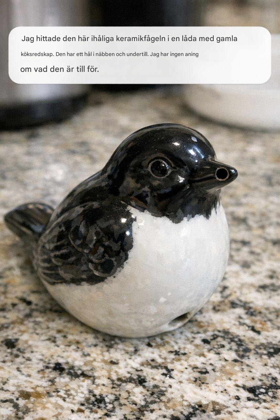 Mens du roder igennem en kasse med gamle køkkenredskaber, støder du på et mærkeligt fund: en hul keramisk fugl med et hul i næbbet og et andet forneden. Den skiller sig ud blandt de sædvanlige gryder, pander og spatler. Hvad kunne den mon bruges til?