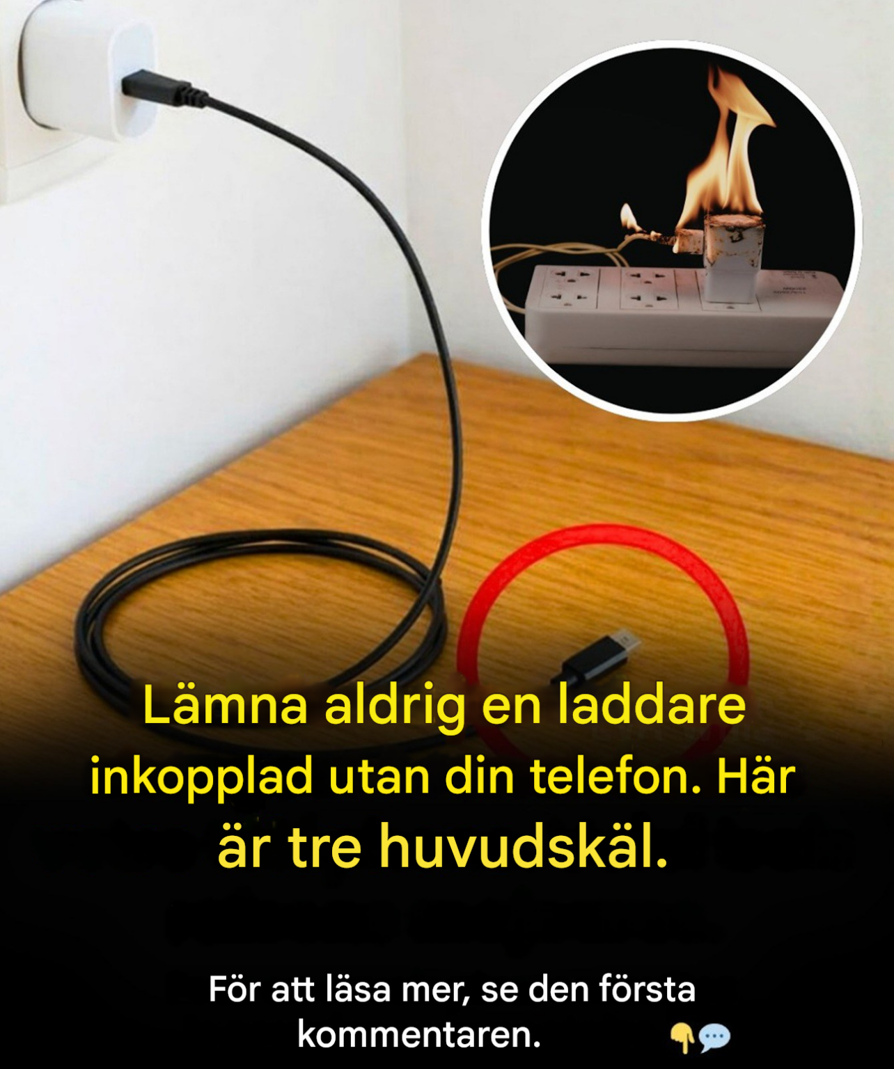 Risikoen øges, når opladeren er gammel, beskadiget eller af dårlig kvalitet. En støvet, løs eller slidt stikkontakt kan også forværre situationen. Mange elektriske hændelser i hjemmet opstår ikke, når et apparat er i brug, men når det efterlades tilsluttet i lange perioder uden opsyn, især natten over eller under længerevarende fravær.