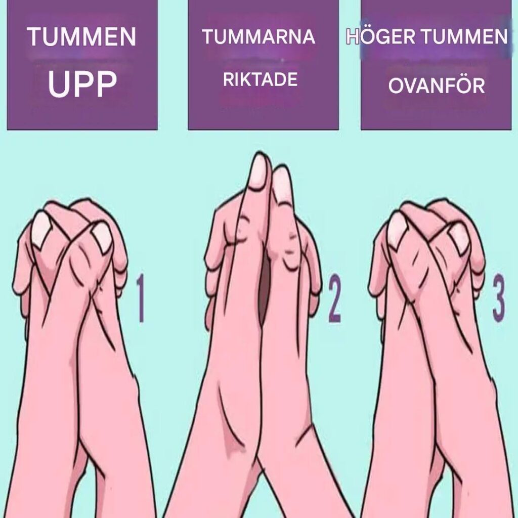 Hvis du normalt holder dine hænder med venstre tommelfinger øverst, betyder det, at du er en eftertænksom person. Du træffer aldrig forhastede beslutninger og foretrækker at stille dig selv de rigtige spørgsmål, før du handler. Faktisk har du en dybt rodfæstet frygt for at begå fejl og blive mødt med kritik. Heldigvis for dig er du ret dygtig til at genkende løgne og manipulationstaktikker. Derudover tager du dig altid tid til at analysere alles adfærd og ideer.