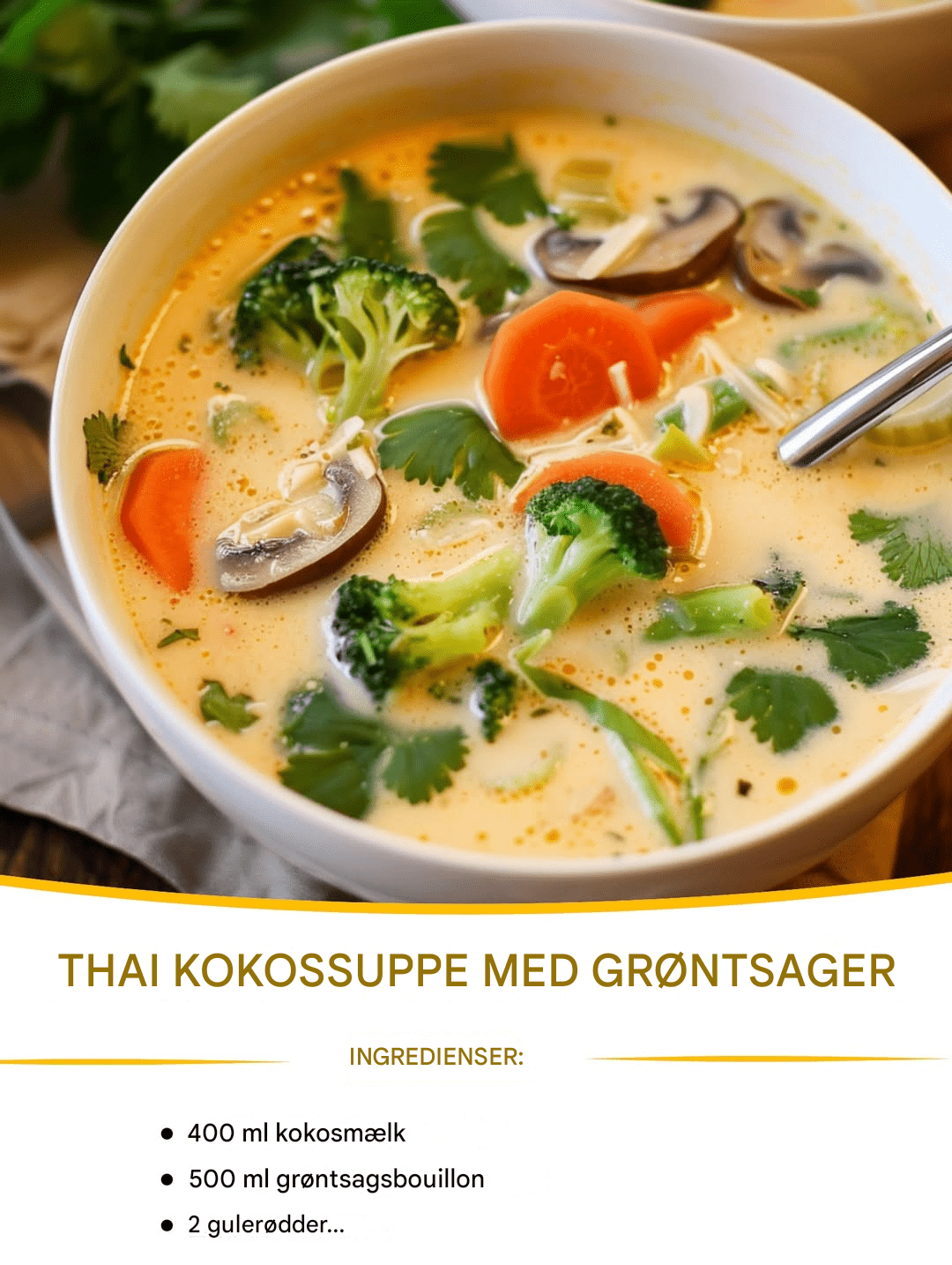Forestil dig at kunne fremtrylle de eksotiske smagsoplevelser fra Thailand i dit hjem med blot et par enkle trin! Denne cremede thailandske kokossuppe med sprøde grøntsager og en perfekt balance mellem varme, friskhed og krydderi er perfekt til alle, der leder efter et kulinarisk eventyr. Nem at tilberede, men fuld af smag – denne opskrift bringer Fjernøsten direkte til din tallerken.