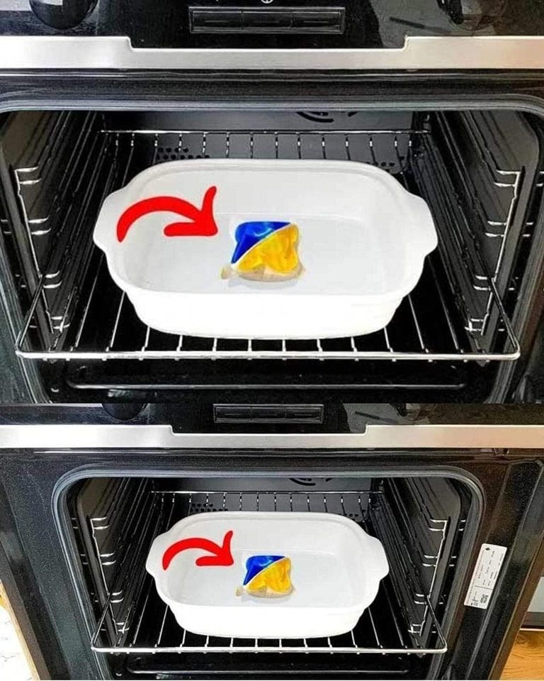 Takket være deres affedtende og desinficerende egenskaber forbliver opvaskemaskinetabletter en effektiv rengøringsløsning til ovnen. For at nyde de mange fordele skal du blot placere en kapsel på en bageplade eller et varmebestandigt fad.